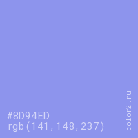 Цвет #8D94ED в цветовой модели RGB обозначается тремя октетами (141, 148, 237) в десятичном формате и #8D94ED в шестнадцатиричном (hex) формате, которые являются интенсивностью красного 141 (hex 8D), интенсивность зелёного 148 (hex 94) и интенсивность синего 237 (hex ED).