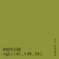 Цвет #8D953B в цветовой модели RGB обозначается тремя октетами (141, 149, 59) в десятичном формате и #8D953B в шестнадцатиричном (hex) формате, которые являются интенсивностью красного 141 (hex 8D), интенсивность зелёного 149 (hex 95) и интенсивность синего 59 (hex 3B).