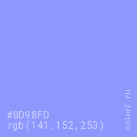 Цвет #8D98FD в цветовой модели RGB обозначается тремя октетами (141, 152, 253) в десятичном формате и #8D98FD в шестнадцатиричном (hex) формате, которые являются интенсивностью красного 141 (hex 8D), интенсивность зелёного 152 (hex 98) и интенсивность синего 253 (hex FD).