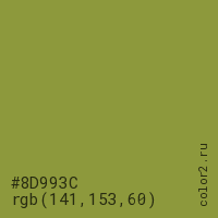 Цвет #8D993C в цветовой модели RGB обозначается тремя октетами (141, 153, 60) в десятичном формате и #8D993C в шестнадцатиричном (hex) формате, которые являются интенсивностью красного 141 (hex 8D), интенсивность зелёного 153 (hex 99) и интенсивность синего 60 (hex 3C).