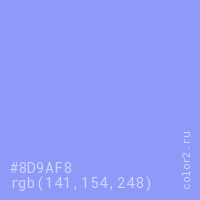 Цвет #8D9AF8 в цветовой модели RGB обозначается тремя октетами (141, 154, 248) в десятичном формате и #8D9AF8 в шестнадцатиричном (hex) формате, которые являются интенсивностью красного 141 (hex 8D), интенсивность зелёного 154 (hex 9A) и интенсивность синего 248 (hex F8).