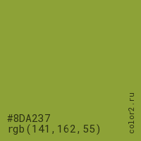 Цвет #8DA237 в цветовой модели RGB обозначается тремя октетами (141, 162, 55) в десятичном формате и #8DA237 в шестнадцатиричном (hex) формате, которые являются интенсивностью красного 141 (hex 8D), интенсивность зелёного 162 (hex A2) и интенсивность синего 55 (hex 37).