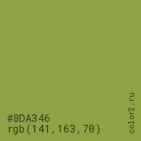 Цвет #8DA346 в цветовой модели RGB обозначается тремя октетами (141, 163, 70) в десятичном формате и #8DA346 в шестнадцатиричном (hex) формате, которые являются интенсивностью красного 141 (hex 8D), интенсивность зелёного 163 (hex A3) и интенсивность синего 70 (hex 46).