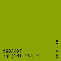 Цвет #8DA407 в цветовой модели RGB обозначается тремя октетами (141, 164, 7) в десятичном формате и #8DA407 в шестнадцатиричном (hex) формате, которые являются интенсивностью красного 141 (hex 8D), интенсивность зелёного 164 (hex A4) и интенсивность синего 7 (hex 07).