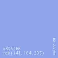 Цвет #8DA4EB в цветовой модели RGB обозначается тремя октетами (141, 164, 235) в десятичном формате и #8DA4EB в шестнадцатиричном (hex) формате, которые являются интенсивностью красного 141 (hex 8D), интенсивность зелёного 164 (hex A4) и интенсивность синего 235 (hex EB).