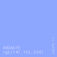Цвет #8DA6FE в цветовой модели RGB обозначается тремя октетами (141, 166, 254) в десятичном формате и #8DA6FE в шестнадцатиричном (hex) формате, которые являются интенсивностью красного 141 (hex 8D), интенсивность зелёного 166 (hex A6) и интенсивность синего 254 (hex FE).