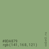 Цвет #8DA879 в цветовой модели RGB обозначается тремя октетами (141, 168, 121) в десятичном формате и #8DA879 в шестнадцатиричном (hex) формате, которые являются интенсивностью красного 141 (hex 8D), интенсивность зелёного 168 (hex A8) и интенсивность синего 121 (hex 79).