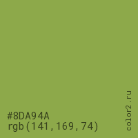 Цвет #8DA94A в цветовой модели RGB обозначается тремя октетами (141, 169, 74) в десятичном формате и #8DA94A в шестнадцатиричном (hex) формате, которые являются интенсивностью красного 141 (hex 8D), интенсивность зелёного 169 (hex A9) и интенсивность синего 74 (hex 4A).