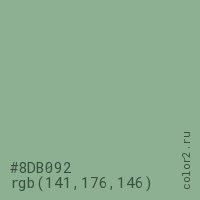 Цвет #8DB092 в цветовой модели RGB обозначается тремя октетами (141, 176, 146) в десятичном формате и #8DB092 в шестнадцатиричном (hex) формате, которые являются интенсивностью красного 141 (hex 8D), интенсивность зелёного 176 (hex B0) и интенсивность синего 146 (hex 92).
