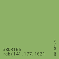 Цвет #8DB166 в цветовой модели RGB обозначается тремя октетами (141, 177, 102) в десятичном формате и #8DB166 в шестнадцатиричном (hex) формате, которые являются интенсивностью красного 141 (hex 8D), интенсивность зелёного 177 (hex B1) и интенсивность синего 102 (hex 66).