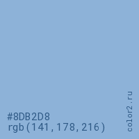 Цвет #8DB2D8 в цветовой модели RGB обозначается тремя октетами (141, 178, 216) в десятичном формате и #8DB2D8 в шестнадцатиричном (hex) формате, которые являются интенсивностью красного 141 (hex 8D), интенсивность зелёного 178 (hex B2) и интенсивность синего 216 (hex D8).