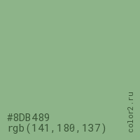 Цвет #8DB489 в цветовой модели RGB обозначается тремя октетами (141, 180, 137) в десятичном формате и #8DB489 в шестнадцатиричном (hex) формате, которые являются интенсивностью красного 141 (hex 8D), интенсивность зелёного 180 (hex B4) и интенсивность синего 137 (hex 89).