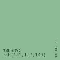 Цвет #8DBB95 в цветовой модели RGB обозначается тремя октетами (141, 187, 149) в десятичном формате и #8DBB95 в шестнадцатиричном (hex) формате, которые являются интенсивностью красного 141 (hex 8D), интенсивность зелёного 187 (hex BB) и интенсивность синего 149 (hex 95).