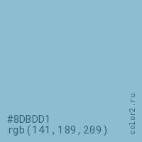 Цвет #8DBDD1 в цветовой модели RGB обозначается тремя октетами (141, 189, 209) в десятичном формате и #8DBDD1 в шестнадцатиричном (hex) формате, которые являются интенсивностью красного 141 (hex 8D), интенсивность зелёного 189 (hex BD) и интенсивность синего 209 (hex D1).