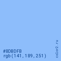 Цвет #8DBDFB в цветовой модели RGB обозначается тремя октетами (141, 189, 251) в десятичном формате и #8DBDFB в шестнадцатиричном (hex) формате, которые являются интенсивностью красного 141 (hex 8D), интенсивность зелёного 189 (hex BD) и интенсивность синего 251 (hex FB).