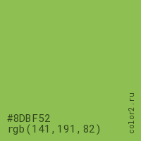 Цвет #8DBF52 в цветовой модели RGB обозначается тремя октетами (141, 191, 82) в десятичном формате и #8DBF52 в шестнадцатиричном (hex) формате, которые являются интенсивностью красного 141 (hex 8D), интенсивность зелёного 191 (hex BF) и интенсивность синего 82 (hex 52).