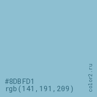 Цвет #8DBFD1 в цветовой модели RGB обозначается тремя октетами (141, 191, 209) в десятичном формате и #8DBFD1 в шестнадцатиричном (hex) формате, которые являются интенсивностью красного 141 (hex 8D), интенсивность зелёного 191 (hex BF) и интенсивность синего 209 (hex D1).
