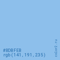 Цвет #8DBFEB в цветовой модели RGB обозначается тремя октетами (141, 191, 235) в десятичном формате и #8DBFEB в шестнадцатиричном (hex) формате, которые являются интенсивностью красного 141 (hex 8D), интенсивность зелёного 191 (hex BF) и интенсивность синего 235 (hex EB).