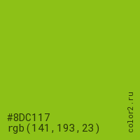 Цвет #8DC117 в цветовой модели RGB обозначается тремя октетами (141, 193, 23) в десятичном формате и #8DC117 в шестнадцатиричном (hex) формате, которые являются интенсивностью красного 141 (hex 8D), интенсивность зелёного 193 (hex C1) и интенсивность синего 23 (hex 17).