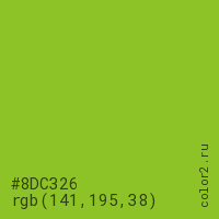 Цвет #8DC326 в цветовой модели RGB обозначается тремя октетами (141, 195, 38) в десятичном формате и #8DC326 в шестнадцатиричном (hex) формате, которые являются интенсивностью красного 141 (hex 8D), интенсивность зелёного 195 (hex C3) и интенсивность синего 38 (hex 26).