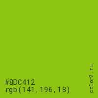 Цвет #8DC412 в цветовой модели RGB обозначается тремя октетами (141, 196, 18) в десятичном формате и #8DC412 в шестнадцатиричном (hex) формате, которые являются интенсивностью красного 141 (hex 8D), интенсивность зелёного 196 (hex C4) и интенсивность синего 18 (hex 12).