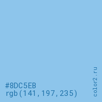 Цвет #8DC5EB в цветовой модели RGB обозначается тремя октетами (141, 197, 235) в десятичном формате и #8DC5EB в шестнадцатиричном (hex) формате, которые являются интенсивностью красного 141 (hex 8D), интенсивность зелёного 197 (hex C5) и интенсивность синего 235 (hex EB).