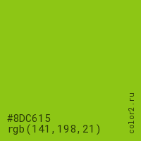 Цвет #8DC615 в цветовой модели RGB обозначается тремя октетами (141, 198, 21) в десятичном формате и #8DC615 в шестнадцатиричном (hex) формате, которые являются интенсивностью красного 141 (hex 8D), интенсивность зелёного 198 (hex C6) и интенсивность синего 21 (hex 15).