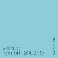 Цвет #8DCCD7 в цветовой модели RGB обозначается тремя октетами (141, 204, 215) в десятичном формате и #8DCCD7 в шестнадцатиричном (hex) формате, которые являются интенсивностью красного 141 (hex 8D), интенсивность зелёного 204 (hex CC) и интенсивность синего 215 (hex D7).
