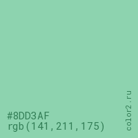 Цвет #8DD3AF в цветовой модели RGB обозначается тремя октетами (141, 211, 175) в десятичном формате и #8DD3AF в шестнадцатиричном (hex) формате, которые являются интенсивностью красного 141 (hex 8D), интенсивность зелёного 211 (hex D3) и интенсивность синего 175 (hex AF).