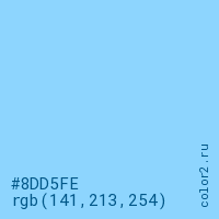Цвет #8DD5FE в цветовой модели RGB обозначается тремя октетами (141, 213, 254) в десятичном формате и #8DD5FE в шестнадцатиричном (hex) формате, которые являются интенсивностью красного 141 (hex 8D), интенсивность зелёного 213 (hex D5) и интенсивность синего 254 (hex FE).
