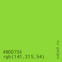 Цвет #8DD736 в цветовой модели RGB обозначается тремя октетами (141, 215, 54) в десятичном формате и #8DD736 в шестнадцатиричном (hex) формате, которые являются интенсивностью красного 141 (hex 8D), интенсивность зелёного 215 (hex D7) и интенсивность синего 54 (hex 36).
