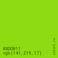 Цвет #8DDB11 в цветовой модели RGB обозначается тремя октетами (141, 219, 17) в десятичном формате и #8DDB11 в шестнадцатиричном (hex) формате, которые являются интенсивностью красного 141 (hex 8D), интенсивность зелёного 219 (hex DB) и интенсивность синего 17 (hex 11).