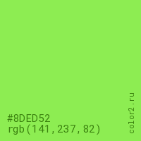 Цвет #8DED52 в цветовой модели RGB обозначается тремя октетами (141, 237, 82) в десятичном формате и #8DED52 в шестнадцатиричном (hex) формате, которые являются интенсивностью красного 141 (hex 8D), интенсивность зелёного 237 (hex ED) и интенсивность синего 82 (hex 52).