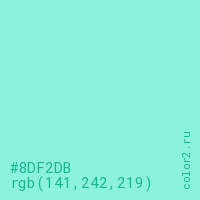 Цвет #8DF2DB в цветовой модели RGB обозначается тремя октетами (141, 242, 219) в десятичном формате и #8DF2DB в шестнадцатиричном (hex) формате, которые являются интенсивностью красного 141 (hex 8D), интенсивность зелёного 242 (hex F2) и интенсивность синего 219 (hex DB).