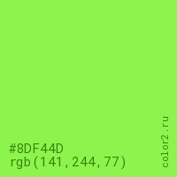 Цвет #8DF44D в цветовой модели RGB обозначается тремя октетами (141, 244, 77) в десятичном формате и #8DF44D в шестнадцатиричном (hex) формате, которые являются интенсивностью красного 141 (hex 8D), интенсивность зелёного 244 (hex F4) и интенсивность синего 77 (hex 4D).