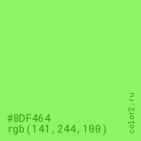 Цвет #8DF464 в цветовой модели RGB обозначается тремя октетами (141, 244, 100) в десятичном формате и #8DF464 в шестнадцатиричном (hex) формате, которые являются интенсивностью красного 141 (hex 8D), интенсивность зелёного 244 (hex F4) и интенсивность синего 100 (hex 64).
