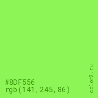 Цвет #8DF556 в цветовой модели RGB обозначается тремя октетами (141, 245, 86) в десятичном формате и #8DF556 в шестнадцатиричном (hex) формате, которые являются интенсивностью красного 141 (hex 8D), интенсивность зелёного 245 (hex F5) и интенсивность синего 86 (hex 56).
