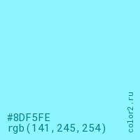 Цвет #8DF5FE в цветовой модели RGB обозначается тремя октетами (141, 245, 254) в десятичном формате и #8DF5FE в шестнадцатиричном (hex) формате, которые являются интенсивностью красного 141 (hex 8D), интенсивность зелёного 245 (hex F5) и интенсивность синего 254 (hex FE).