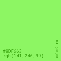 Цвет #8DF663 в цветовой модели RGB обозначается тремя октетами (141, 246, 99) в десятичном формате и #8DF663 в шестнадцатиричном (hex) формате, которые являются интенсивностью красного 141 (hex 8D), интенсивность зелёного 246 (hex F6) и интенсивность синего 99 (hex 63).