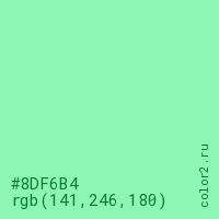 Цвет #8DF6B4 в цветовой модели RGB обозначается тремя октетами (141, 246, 180) в десятичном формате и #8DF6B4 в шестнадцатиричном (hex) формате, которые являются интенсивностью красного 141 (hex 8D), интенсивность зелёного 246 (hex F6) и интенсивность синего 180 (hex B4).