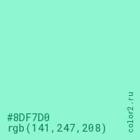 Цвет #8DF7D0 в цветовой модели RGB обозначается тремя октетами (141, 247, 208) в десятичном формате и #8DF7D0 в шестнадцатиричном (hex) формате, которые являются интенсивностью красного 141 (hex 8D), интенсивность зелёного 247 (hex F7) и интенсивность синего 208 (hex D0).