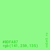 Цвет #8DFA87 в цветовой модели RGB обозначается тремя октетами (141, 250, 135) в десятичном формате и #8DFA87 в шестнадцатиричном (hex) формате, которые являются интенсивностью красного 141 (hex 8D), интенсивность зелёного 250 (hex FA) и интенсивность синего 135 (hex 87).