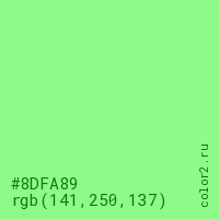 Цвет #8DFA89 в цветовой модели RGB обозначается тремя октетами (141, 250, 137) в десятичном формате и #8DFA89 в шестнадцатиричном (hex) формате, которые являются интенсивностью красного 141 (hex 8D), интенсивность зелёного 250 (hex FA) и интенсивность синего 137 (hex 89).