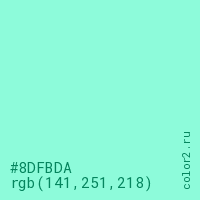 Цвет #8DFBDA в цветовой модели RGB обозначается тремя октетами (141, 251, 218) в десятичном формате и #8DFBDA в шестнадцатиричном (hex) формате, которые являются интенсивностью красного 141 (hex 8D), интенсивность зелёного 251 (hex FB) и интенсивность синего 218 (hex DA).