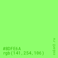 Цвет #8DFE6A в цветовой модели RGB обозначается тремя октетами (141, 254, 106) в десятичном формате и #8DFE6A в шестнадцатиричном (hex) формате, которые являются интенсивностью красного 141 (hex 8D), интенсивность зелёного 254 (hex FE) и интенсивность синего 106 (hex 6A).