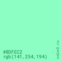 Цвет #8DFEC2 в цветовой модели RGB обозначается тремя октетами (141, 254, 194) в десятичном формате и #8DFEC2 в шестнадцатиричном (hex) формате, которые являются интенсивностью красного 141 (hex 8D), интенсивность зелёного 254 (hex FE) и интенсивность синего 194 (hex C2).