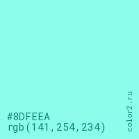 Цвет #8DFEEA в цветовой модели RGB обозначается тремя октетами (141, 254, 234) в десятичном формате и #8DFEEA в шестнадцатиричном (hex) формате, которые являются интенсивностью красного 141 (hex 8D), интенсивность зелёного 254 (hex FE) и интенсивность синего 234 (hex EA).