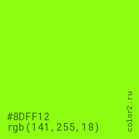 Цвет #8DFF12 в цветовой модели RGB обозначается тремя октетами (141, 255, 18) в десятичном формате и #8DFF12 в шестнадцатиричном (hex) формате, которые являются интенсивностью красного 141 (hex 8D), интенсивность зелёного 255 (hex FF) и интенсивность синего 18 (hex 12).