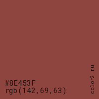 Цвет #8E453F в цветовой модели RGB обозначается тремя октетами (142, 69, 63) в десятичном формате и #8E453F в шестнадцатиричном (hex) формате, которые являются интенсивностью красного 142 (hex 8E), интенсивность зелёного 69 (hex 45) и интенсивность синего 63 (hex 3F).