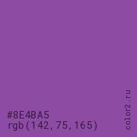 Цвет #8E4BA5 в цветовой модели RGB обозначается тремя октетами (142, 75, 165) в десятичном формате и #8E4BA5 в шестнадцатиричном (hex) формате, которые являются интенсивностью красного 142 (hex 8E), интенсивность зелёного 75 (hex 4B) и интенсивность синего 165 (hex A5).